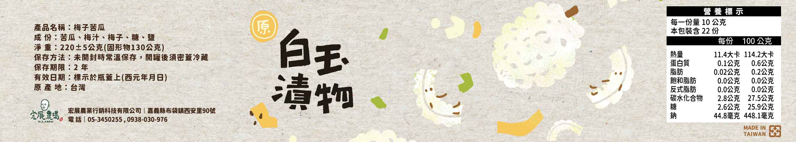 2011年將故鄉「嘉義布袋」做為農業生產基地,一個非常靠近海邊的小鄉鎮,每天吹著鹹鹹的海風,培育出白白淨淨的白玉苦瓜。因非常嚴厲的環境而促使了台灣農業的進步,我們堅持於產銷履歷友善土地的栽種方式,將地方性的苦瓜產業,推向另外一個六級產業,於是2013年成立「宏展農場」。